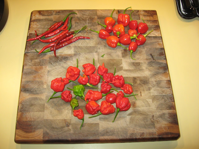 About the only thing I think I can do with them Reapers is make sauce. They're not producing a lot of Chiles, but its right amount to make a bottle of sauce. I've started with the Reaper Sauce, and just made another I'm calling Grim Reaper Sauce. Itz a Halloween thing...